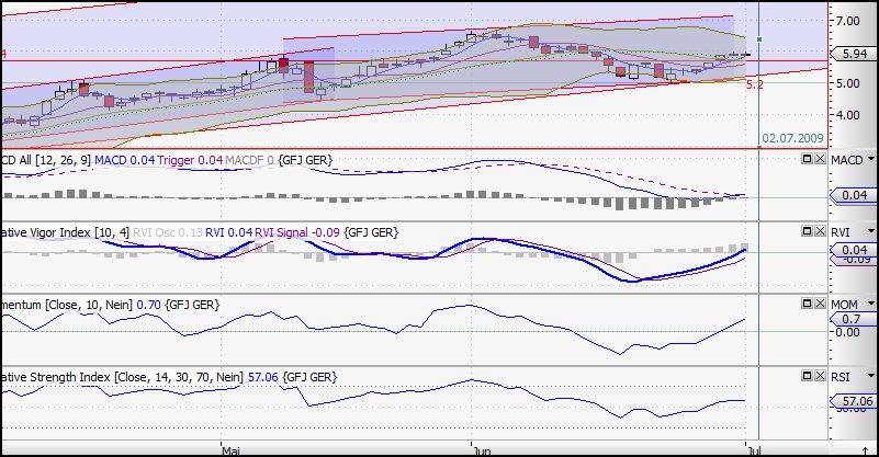 Inzwischen notiert der Wert wieder unter den benannten Trendlinien, die aktuell bei 5,94 und 6,20 Euro verlaufen. Damit ist der Ausbruchsversuch gescheitert. Eine Beschleunigung der Aufwärtsbewegung ist damit zunächst kein Thema.