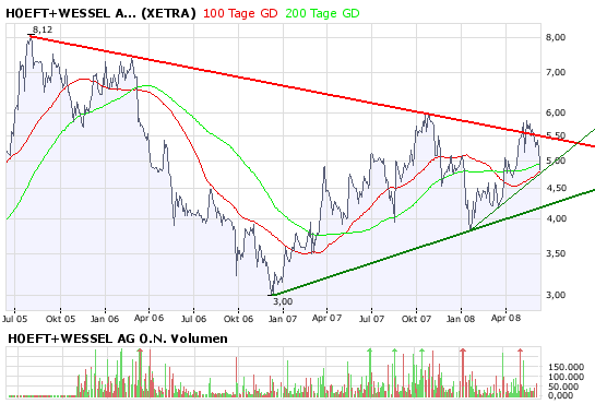 Die Aktie von Höft & Wessel verliert derzeit 1,62 Prozent auf 5,46 Euro. (29.05.2008/ac/n/nw)