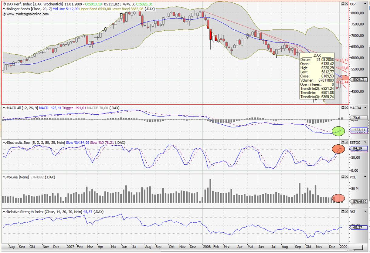 Kurse. Ich denke, wir werden nochmals auf die 4.900, im schlechteren Fall auf die 4.820 zurücklaufen, um dann den letzten Anstieg auf die 5.330 zu nehmen. Dannach entscheidet es sich. Persönlich tendiere ich auch eher zu fallenden Kursen bis Herbst 2009 - aber so viele warten darauf, dass die Kurse zurückkommen, so viele warten auf ein Szenario wie 2001-2003. Was wäre, wenn man versuchen würde diese durch eine Zins, Konjunkturporgramm oder einfach nur Obama Ralley auf dem falschen Fuß zu erwischen und durch immer steigende Kurse zum EInstieg zu "zwingen". Hört sich vielleicht doof an - wäre aber nicht das erste Mal, das sowas passiert.