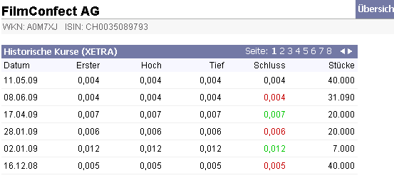 Normaler Weise ist es doch so: In der Liste derer "historischen" Curse stehen die ältesten Volumina UNTEN und die jüngsten Volumina stehen OBEN. - So hat das auch ARIVA versucht, und der Versuch begann viel versprechend. - Auf das XETRA-Volumen vom 16.12.2008 folgt das vom 2.1. und vom 28.1.2009, auf dieses dann das vom 17.4.2009. - Das Volumen der FilmConfect AG (WKN: A0M7XJ; ISIN: CH0035089793) ist halt nicht das dickste, so dass man sich zunächst auch nicht wundert, dass nach dem Volumen vom 17.4. erst wieder am 8.6.2009 ein XETRA-Volumen festgestellt worden sein soll.
