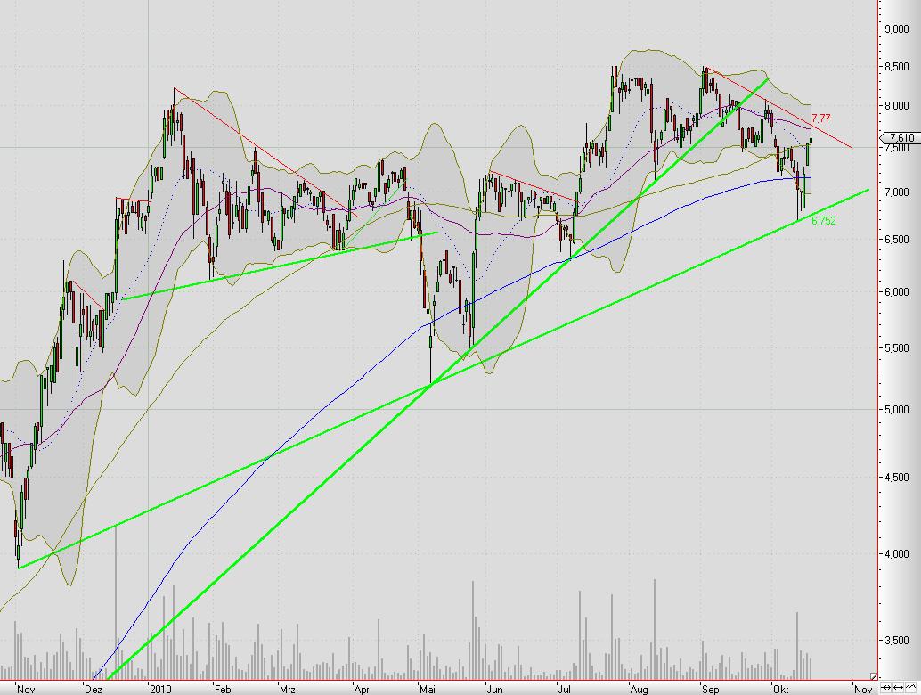Aus dem Abwärtskanal ist man raus ! Jetzt muss noch mit dem SK der Wiederstand bei 7,51 € aus dem weg geräumt werden , das wäre wichtig für einen weiteren Anstieg !