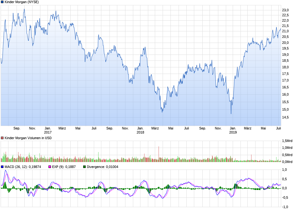 Ich denke aber, es muss sehr viel passieren, damit die "Langweiler"-Aktien wieder mehr geschätzt werden. Die Musik spielt im Nasdaq. Schlanke Wachstumsaktien sind gerade gefragt. Kinder Morgan gehört nicht dazu. Es gibt ja auch die Weisheit: The trend is your friend. Selbst wenn die Aktie aus welchem Grund auch immer wieder steigen wollte, müsste sie erstmal einen tragfähigen Boden ausbilden. Das heißt, mit stärker steigenden Kursen rechne ich mittelfristig nicht.