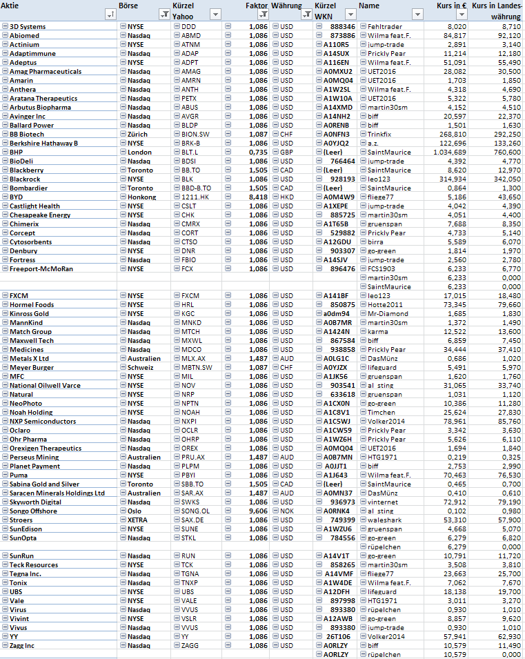 Einige davon, wurden zwar für deutsche Börsenplätze gemeldet, doch dort gab es keine regelmäßigen Kurse bei Yahoo-finance, so dass ich sie umgesetzt habe.