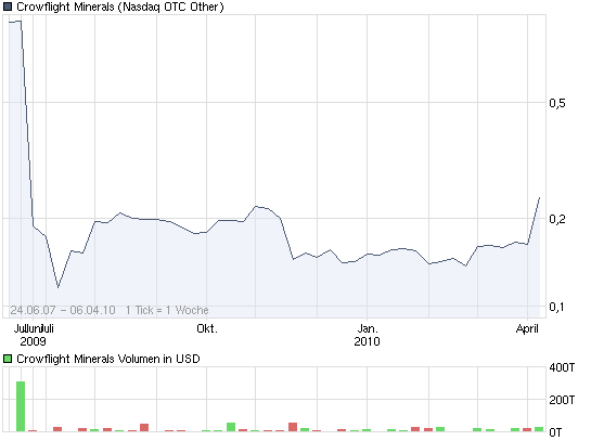 TORONTO, ONTARIO - (Marketwire - 6. April 2010) - Crowflight Minerals Inc. ("Crowflight" oder das "Unternehmen") (TSX: CML) hat heute bekannt, dass es ein Angebot Schreiben (das "Angebot") aus Jinchuan erhalten Group Ltd ("Jinchuan"), um alle Stammaktien von Crowflight in Betracht zu erwerben für ein Aggregat Barzahlung von $ 150.000.000. Basierend auf der aktuellen Anzahl der ausstehenden Stammaktien von Crowflight, entspricht dieses Angebot auf rund 0,26 USD je Stammaktie. Das Angebot entspricht einer Prämie von 47,3% auf den Schlusskurs an der Toronto Stock Exchange für die Unternehmens-Stammaktien am 2. April 2010 und einer Prämie von 56,8% zu den 20 Tagen gewichteten durchschnittlichen Börsenkurs.
