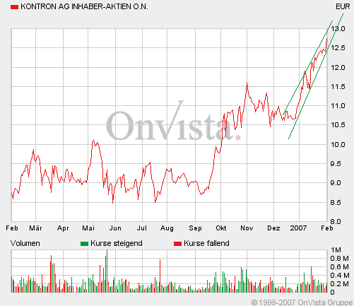 Die Unterstützungslinie des Trendkanals wurde durchbrochen! Kontron steht vor dem schwersten Widerstand seit 2001. Im Dezember 2001 unterbrach Kontron an der Unterstützung von ca.12,-€ den Abwärtstrend, prallte am Widerstand von knapp 13,- € ab und setzte den marktkonformen Abwärtstrend fort. Invers bedeutet dies, es gibt eine Unterstützung bei ca. 12,-€, die sich im Moment stark um 12,40 € herausbildet und der Widerstand bei 13,- € steht uns noch bevor. Ist dieser gebrochen, ist nach oben keine signifikante Störung zu erkennen. Ich schlage vor, Gewinne absichern und investiert bleiben. Schwankungen im Tecdax von 10-20% sollten Berücksichtigung finden. Als wesentlicher Meilenstein sollte die PK am 28.03.2007 im Auge behalten werden. Aus dem Bauch heraus schwierig wird die Zeit bis zur HV am 27.06.2007 eingeschätzt, hier ist der für mögliche Rücksetzer bekannte Mai als emotionale Hürde zu sehen.