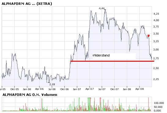 Nachdem ich letztes Jahr alle meine Alphaforms zu 4,20 Euro verkauft hatte, als Alphaform den Dividendenvorschlag von 0,20 euro im Mai 07 zurückgezogen hatte, warte ich nun eine Bodenbildung ab, um günstig wieder einzusteigen.