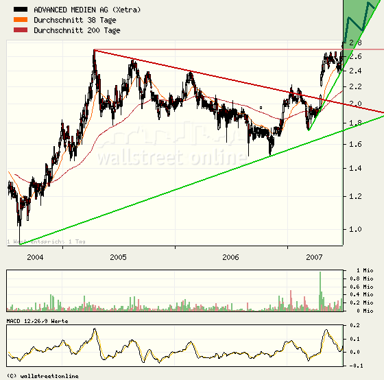 München (aktiencheck.de AG) - Die Experten von "BetaFaktor" raten bei der Aktie von Advanced Medien (ISIN DE0001262186/ WKN 126218) keine Stücke aus der Hand zu geben. Auf der nächste Woche stattfindenden Hauptversammlung könnten sich die Aktionäre der Advanced Medien AG beruhigt zurücklehnen. Otto Dauer, Vorstandschef von Advanced Medien, werde aller Voraussicht nach, von einem steigenden Interesse von Institutionellen berichten. Dies würden die jüngsten Kursaktivitäten bereits anzeigen. Gegenüber den Experten habe Dauer berichtet, dass er im Mai und Juni einige Male auf Roadshow gewesen sei. Insbesondere UK-Fondmanager hätten den Medienwert nun scheinbar entdeckt. Nach Angaben von Dauer gebe es auch Anfragen für außerbörsliche Umplatzierungen, aber er könne nicht alles bedienen. Die Experten seien bei der Aktie des Münchener Medienunternehmens vor rund drei Monaten in ihrem Musterdepot unglücklich ausgestoppt worden. Seither sei der Kurs um über 30% weitergelaufen. Dennoch: Die Experten würden über einen Neukauf nachdenken. Wer noch in der Aktie von Advanced Medien investiert ist, sollte nach Meinung der Experten von "BetaFaktor" keine Stücke abgeben. Denn der Sprung über die 3-Euro-Marke erscheine jetzt eher als eine Frage von Wochen denn von Monaten. (Ausgabe 26/07b vom 28.06.2007) (29.06.2007/ac/a/nw)