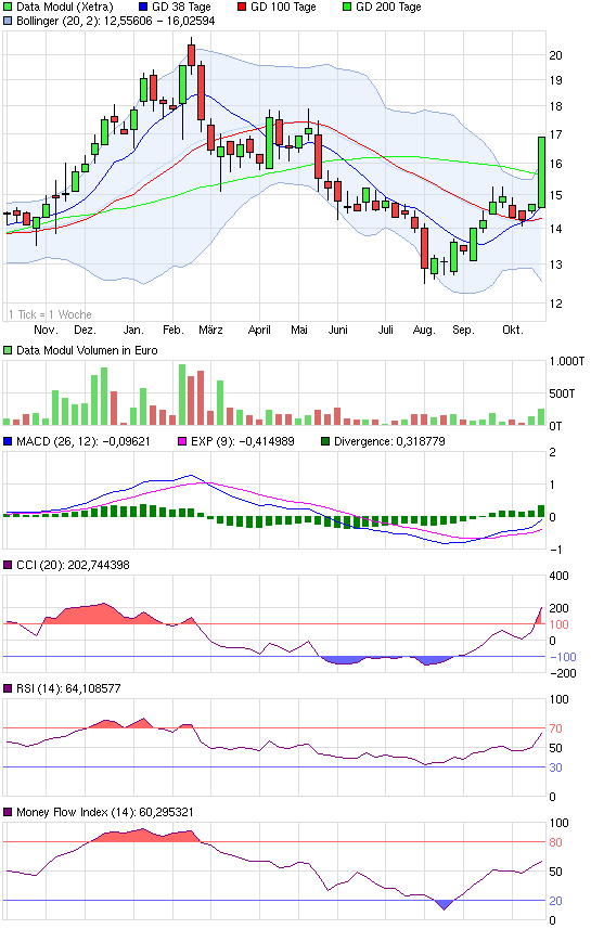 Könnt aber auch sein, dass wir nicht mehr zum Zuge kommen, denn vom Chart her ist eine etwas deutlichere Gegenbewegung durchaus angebracht/realistisch. Nur wenn die 9 Monatszahlen nochmals richtig schlecht werden, könnten wir zu 11,x € nochmal einsteigen. Werd mich dann im November auf die Lauer legen. Bis darin rechne ich grob mit ner Seitwärtsbewegung zwischen 12,5 und 14,5 €.