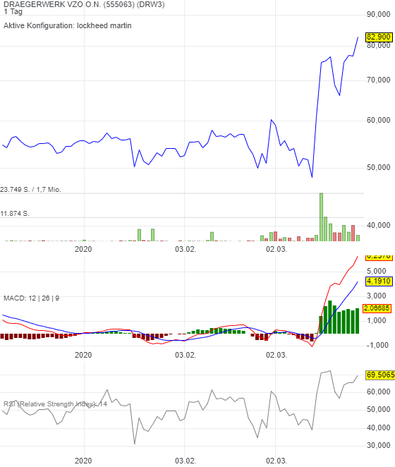 Verdreifachung der Produktion im 24 Stunden Schichtbetrieb. Beatmungsgeräte und Patientenmonitore für Aufwachraum und Intensivstation werden Weltweit benötigt https://www.welt.de/vermischtes/article206600921/...nkenhaeusern.html . Solche Geräte kosten soviel wie ein Kleinwagen. Aktienkurse bei Draegerwerk von über 120 EUR sind in Kriegszeiten gegen das Coronavirus gerechtfertigt. Schaut euch mal den Aktienkurs von NIHON KOHDEN (www.nihonkohden.com) einem japanischen Hersteller von Medizingeräten und Patientenmonitoren für die ganze Welt an, der geht auch seit Jahresanfang steil nach oben, aber an der Deutschen Börse kann man nur Draegerwerk kaufen. Die Produktion beider Firmen läuft unter Volllast und täglich Rollen LKW vollbeladen mit Medizingeräten vom Lager zu den Flughäfen um die ganze Welt zu beliefern. Die Medizinischen Geräte in den Kliniken sind über zwanzig Jahre alt und müssen nun dringend erneuert werden. Jahrelange Sparmaßnahmen der Regierungen im Gesundheitswesen führen nun zum Notstand und erst jetzt fliesen Gelder ins Gesundheitswesen zur Erweiterung der Klinikbetten. Letztes Jahr wollte man noch Kliniken auf dem Land abschalten weil die Betten nicht voll belegt waren und heute muss man auf Hotelzimmer und Sporthallen ausweichen. Abgezogenes Kapital der Automobilhersteller kann dieses Jahr in Medizintechnikfirmen fließen und ist gut für die Gesundheit.