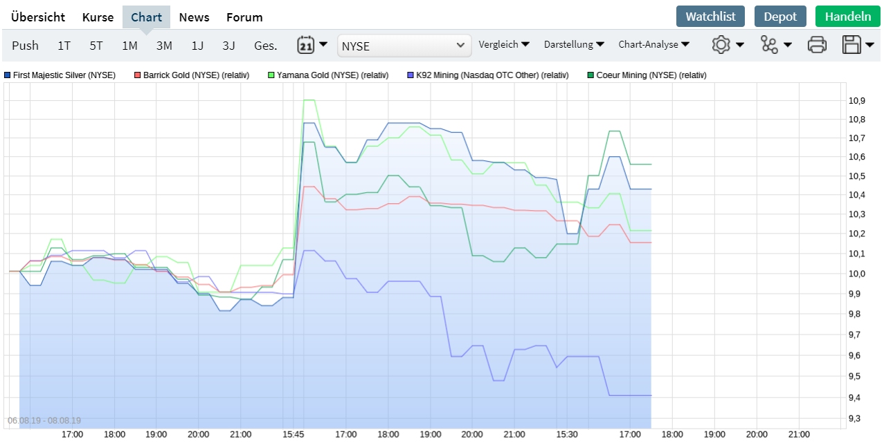 Und gestern wurde nicht nur Couer abverkauft ! Auch andere Value Werte sind erst gestiegen und wurden dann zum Handeksende abverkauft sodass der Gold-/Silberpreisanstieg gestern bei den Minen völlig verpuffte ! First Majestic , Yamana , K92 im Endeffekt alle Werte.