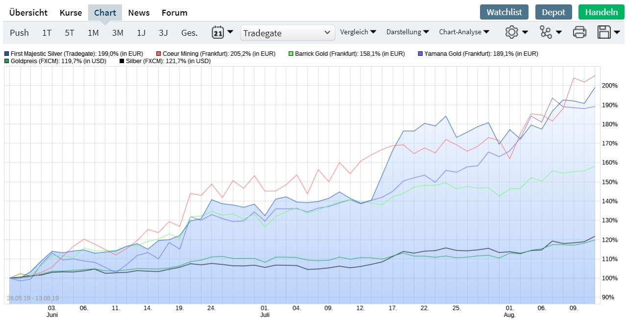 Coeur Mining ist sehr reaktionsfreudig was Edelmetallkurse angeht. Wie man sehen kann hat Coeur Mining aber alles geschlagen was im Chart im Vergleich steht. First Majestic Silber ebenfalls. Solange die Edelmetalle nach oben gehen, geht Coeur Mining auch ab. Gewinnmitnahmen schlagen aber auch schneller und tiefer ein als bei anderen Aktien. Was nicht schlecht sein muss. Zum Einstieg sehr nützlich. Am Ende bleiben die Longtrader und die Zocker kommen nur noch schwer rein ohne den Kurs bis sonstwo zu pushen. Also schauen wir mal ob der Trump es schafft die FED zu größeren Zinssenkungen zu bewegen. Der geht ja offenbar über Leichen. Er wird wohl den Handelskrieg toben lassen um die Märkte zu drücken, bis die Fed und der Rest der Welt sich gezwungen sieht zu tun was er will. Oder er wird abgesägt bzw. irgendwie zum Gegenhandeln gezwungen. Das Szenario muss aber erstmal gebastelt werden. Dazu müssten sich ja auch die Europäer mal zusammentun und gegen die USA schießen... ähm... na klar. Die Europäer zusammentun... wenn es nicht so traurig wäre...