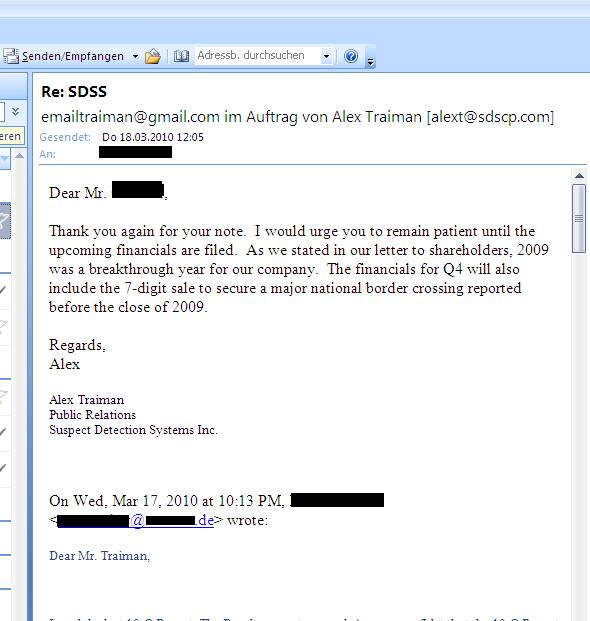 Thank you for your email. SDSS is a young company that is already performing commercially in several corners of the world. Our technology has been implemented in the US, Mexico, India, South Africa, Singapore, Azerbaijan and Guatemala. Our management team is committed to expanding the customer base, and to bringing the company's story to the investor market. The technology is in demand, and extremely effective. 2009 was a breakthrough year for SDSS, and we look forward to another breakthrough year in 2010.