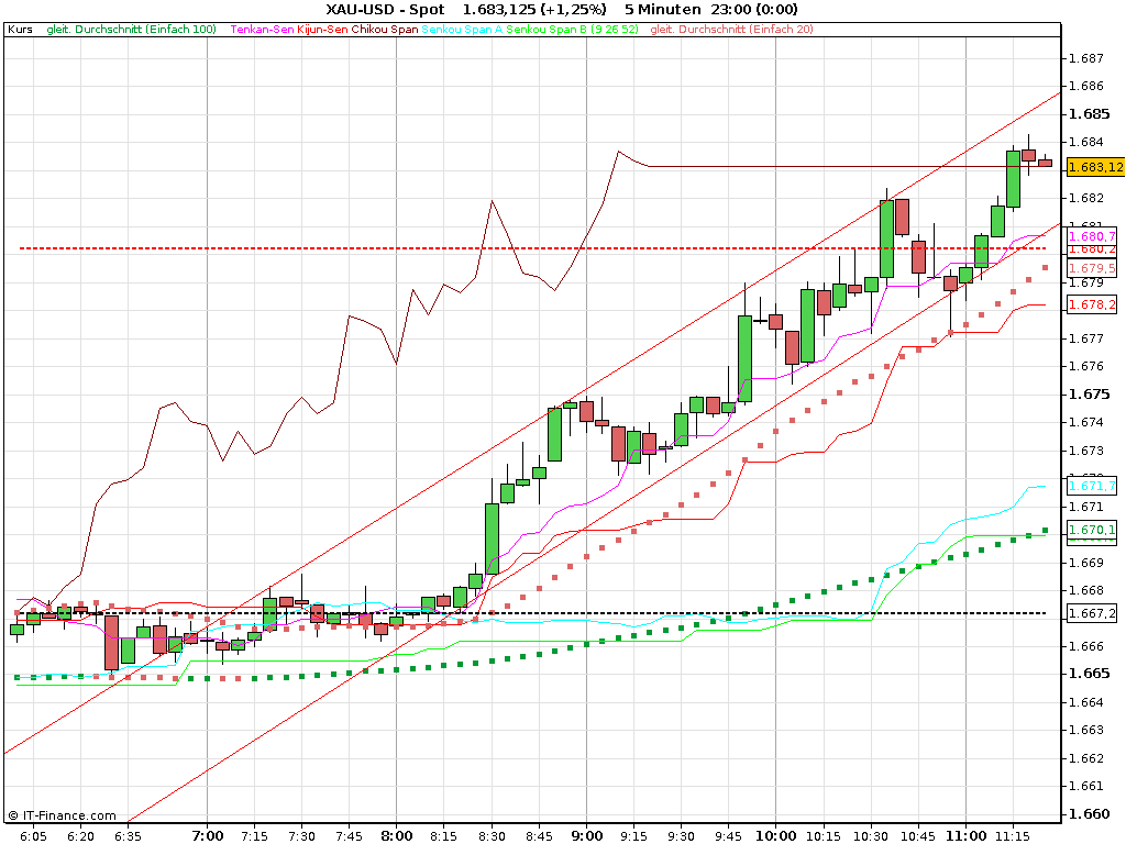 Wir sehen gestern und heute eine Seitwärtsbewegung, wie gestern angedeutet, da nach über 900 Punkten in wenigen Tagen, die Aufwärtsdynamik natürlich nachlässt. Durch diese Seitwärtsbewegung steht ein Ausbruch von ca. 140 Punkten bevor. Erst unter 5600 muss man die Situation neu bewerten und erst unter 5300 gibt es neue Tiefs. Ganz kurzfristig ist natürlich die Trendlinie bei 5900 wichtig. Schliesst der DAX darunter, ist das ein Zeichen, dass der Kaufdruck nachgelassen hat.