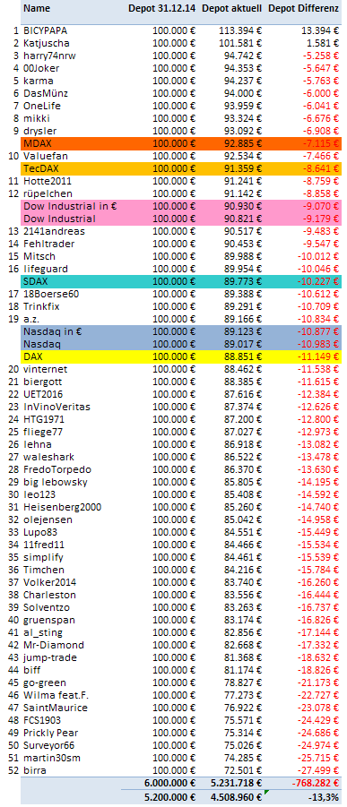 Nun wieder zur Übersicht: Immerhin 4 Depots haben es geschafft, in den schwarzen Zahlen zu bleiben. Und der Spitzenreiter nach der ersten Woche, BICYPAPA, liegt schon mit 18T e im Plus. Katjuscha ist der einzige aus dem Spitzenfeld des letzen Jahres, der auch dieses Jahr wieder an der Spitze beginnt, auf Platz 3, genau da, wo er im letzten Jahr aufgehört hat. Das finde ich schon erstanlich.