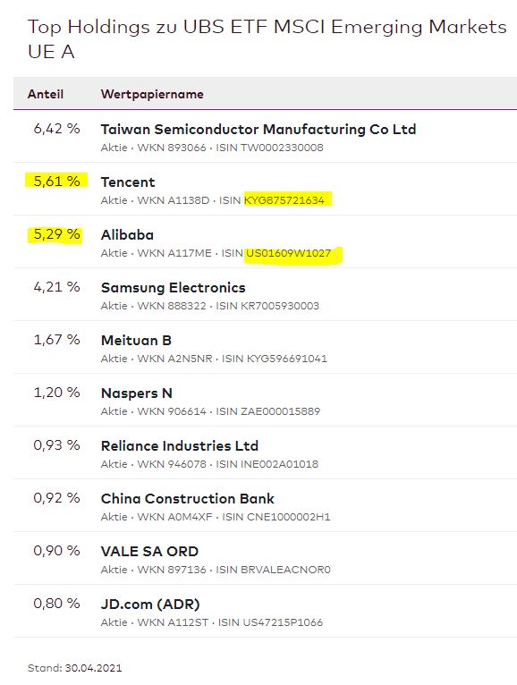 Der guten Ordnung halber sei auch noch erwähnt, daß Tencent und Alibaba im ETF auf die EM mit der ISIN LU0480132876 ebenfalls recht ordentlich vertreten sind, s. Screenshot. Insofern betrachte ich mich als – auf Dauer – hinreichend investiert in diese beiden Titel und sehe von einem Direktkauf der Einzeltitel jeweils weiter ab.