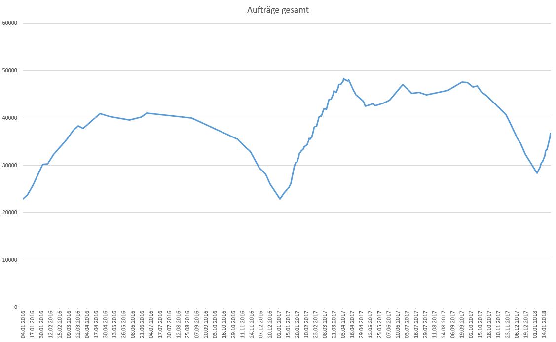 Die ersten TV Werbung ist schon wieder gesichtet und die Partnerzahlen sind in der ersten Woche des neuen Jahres auch schon wieder nach meinen Schätzungen um 150 gestiegen. Nachdem Q4 mit geschätzt +750 Partner ausergewöhnlich gut gelaufen zu sein scheint, startet 2018 auch wieder sehr gut Beobachtungen des Branchenbuchs nach zu urteilen. Um das Partnerwachstum bewerten zu können, die Gesamtpartnerzahl liegt bei MyHammer ca. bei 20.000.