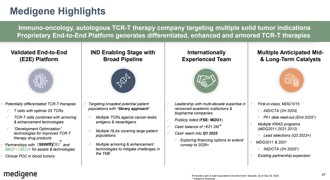 Medigene setzt weiterhin auf Möglichkeiten für Partnerschaften, auch für einige seiner derzeit angekündigten Produktkandidaten, um deren weitere Entwicklung zu beschleunigen.