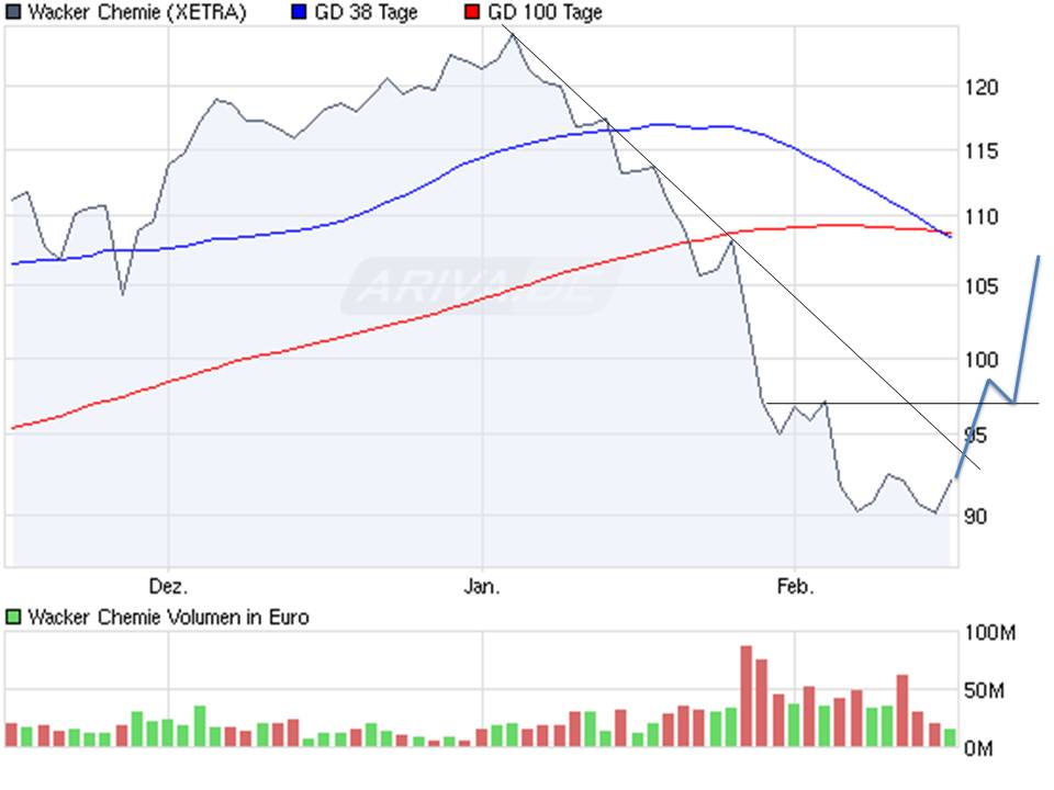 Gerüchten zufolge, die heute am Frankfurter Parkett kursieren, soll sich der Chemiekonzern BASF bereits an die Wacker-Familie gewandt haben, um die Chancen eines Übernahmeangebotes auszuloten. Händlern zufolge steht ein Angebotspreis von mindestens 120 Euro je Aktie im Raum. Vom aktuellen Niveau aus würde dies einem Aufschlag von 25 Prozent entsprechen.