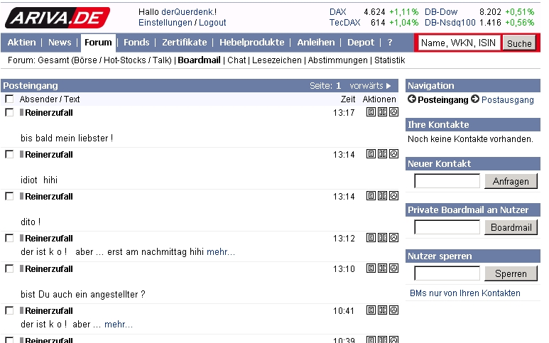 Gehts noch ? Erst willst mich in deine Kontakte adden, hab ich ja nichts dagegen, und dann bekomm ich alle paar Minuten deine Boardmessages. Für was haben wir den das Forum ?