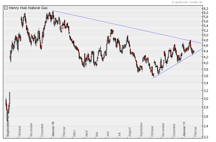 Die Lagervorräte sind deutlich zurück gegangen, liest man die Kommentare dazu, so soll der Erdgaspreis wohl noch künstlich unten gehalten werden. Scheinbar möchte man dem Durchschnitts-Ami nicht zumuten gleichzeitig an der Tankstelle und beim Heizen abgezockt zu werden. Ich schließe mal daraus, solange der Ölpreis steigt,wird sich beim Erdgas nicht viel tun und es erstmal seitwärts läuft. Es wurde hier auch viel Blödsinn wegen Catango bzw. Rollverlusten gesprochen. Entscheidend dafür ist zum Einen, welches Wertpapier eingesetzt wird ( das ist von Emitent zu Emitent unterschiedlich ) und in welche Richtung sich die Futures entwickeln. Mein eingesetztes Index-Zertifikat weißt keinerlei Roll/Catangoverluste bis dato aus. Wer sich zum Kauf eines Index-Zertifikats entscheidet kann ganz einfach die Historie des entsprechenden Zertifikats mit dem Chartverlauf von Erdgas vergleichen. Aber wie gesagt, dass ist von Emitent zu Emitent unterschiedlich. Bitte nicht so viel Blödsinn erzählen und erstmal genau vergleichen. Fakt ist, dass die Lagervorräte deutlich zurückgekommen sind. Den entsprechenden Bericht stelle ich hierein und jeder kann sich dazu seine Meinung bilden.