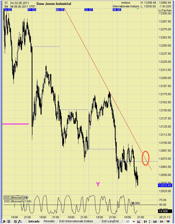 Wie deutlich im Chart zu sehen ist, gelang dem DAX weder ein "in-time up" an der v' der v vorbei, noch konnte er die v per "in-time up" retracen. Die Zeit dafür ist bereits abgelaufen. Das war es was mir gestern nicht gefiel. Nämlich, daß es nicht einmal für ein "in-time up" an der v' der v vorbei gereicht hat.