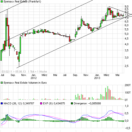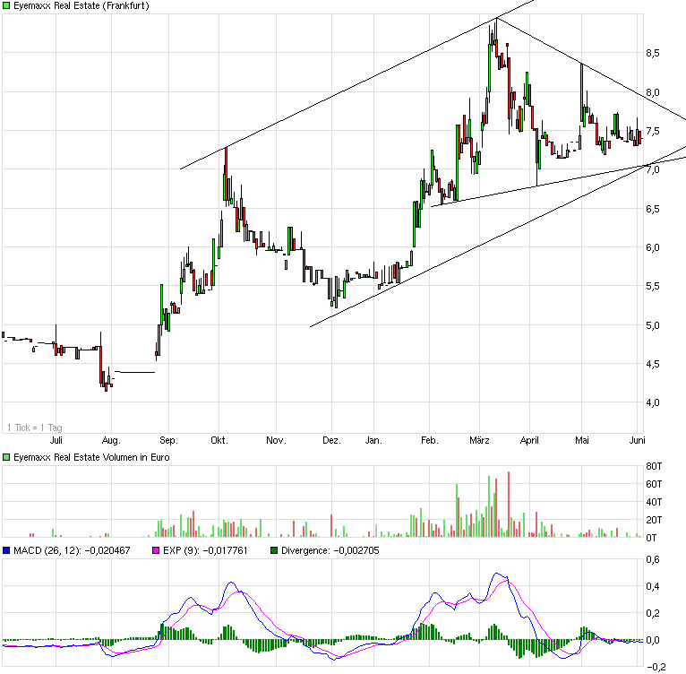 Die 7 EUR entwickelt sich zu einer bedeutenden Unterstützung. Die mehrmonatige Wimplebildung deutet auf einen baldigen Ausbruch hin. Die Wahrscheinlichkeit, dass es bald einen deutlichen Schub Richtung Norden gibt, sehe ich als recht hoch an. Seit mehreren Wochen gibt es kaum noch größeres Stückzahlen unterhalb 7,50 EUR. Der Boden scheint gefunden...
