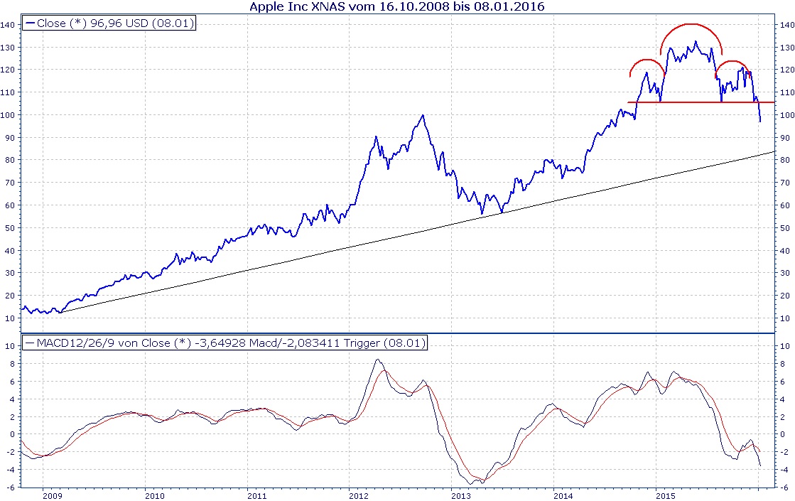 Laut Maydorn und Co beispielsweise hätte man die Apple-Aktie 2015 auch noch bei Kursen von um die 120-130USD unbedingt Kaufen müssen, da die Aussichten und das Wachstum nahezu unbegrenz seien, Zukunftskonzern, Visionäre, bla bla bla...... Erst gestern rief ein gewisser Herr maydorn vor den zahlen zum Kauf auf...