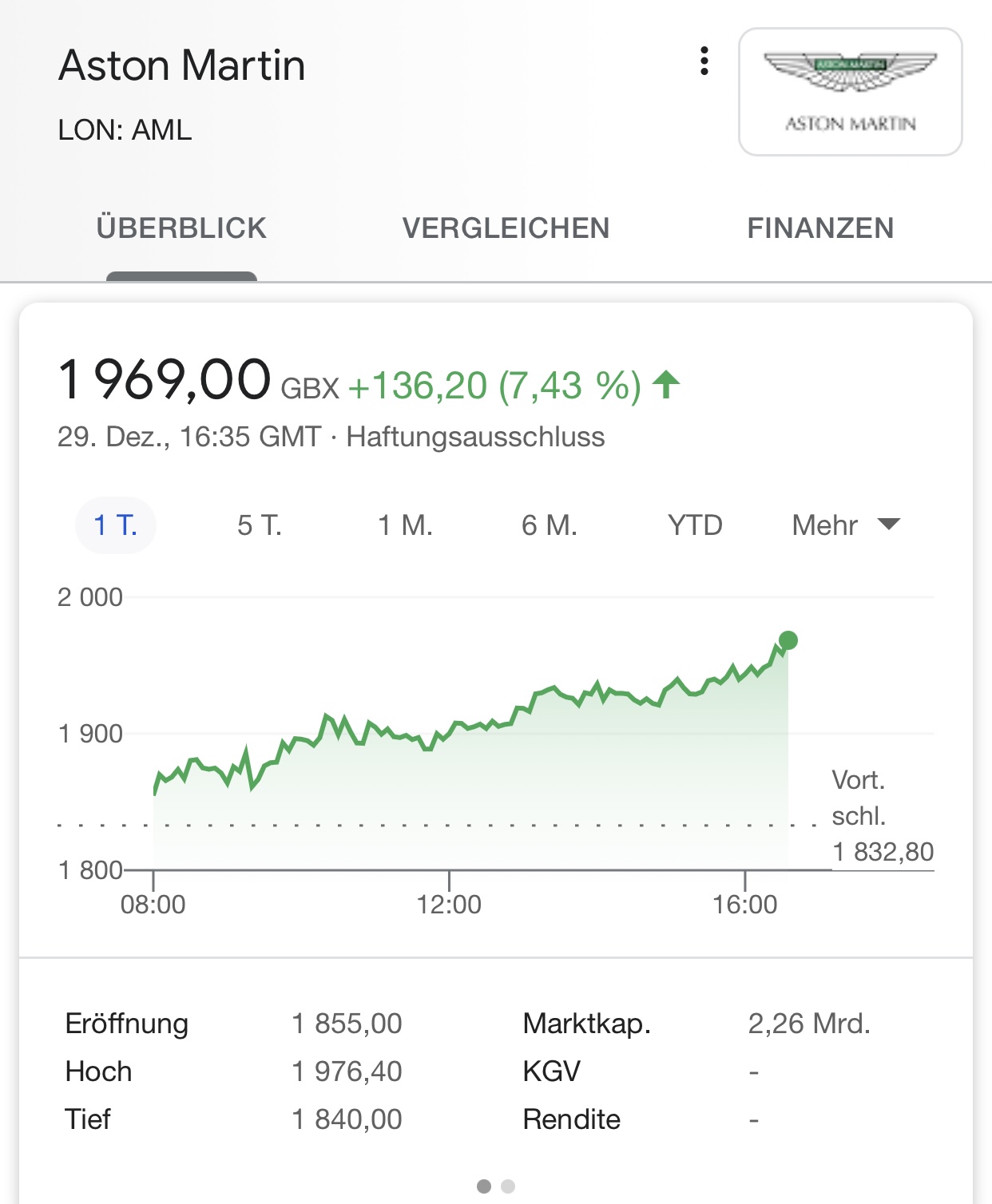 Geil - Aston Martin gibt richtig Gas! Auch ein gutes Zeichen, dass kurz vor Schluss der Londoner Börse der Kurs nochmal deutlich anzieht. Wenn die mit Abstand größte Position in meinem kleinen Depot so gut steigt, ist man natürlich happy.