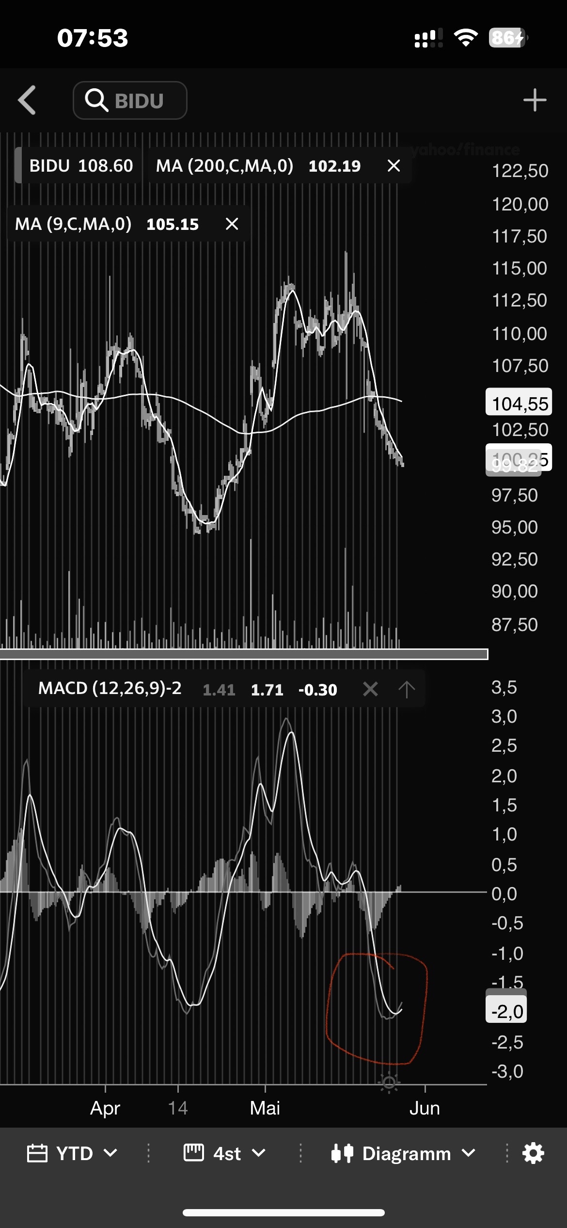 Guten Morgen, wer bei BIDU lauert, kann bei 89€ für die ADR ein Kauf-Limit einstellen. Gemäß MACD ist die Wahrscheinlichkeit eines Rebounds jetzt groß. Die Aktie ist etwas überverkauft. Zudem stehen potenziell gute Nachrichten bzgl der Zusammenarbeit mit TESLA und APPLE an.