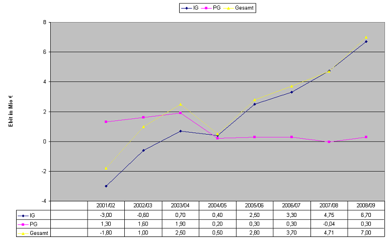 3. Ab 2004/05 konzentrierte sich AJA dann auf das IG. Man verzeichnete dann parallel stark fallenden Gesamtumsätze durch die sinkenden PG-Umsätze und stark steigende Ebits im IG. Das glich sich aus, aber die Anleger erkannten es noch nicht. Parallel dazu muss man den Punkt 1 betrachten.