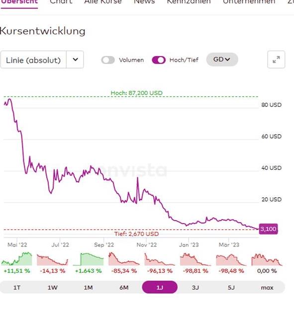 400 Mio. $ verloren - das ist schon eine Leistung! Vielleicht kommt ja nochmal eine gute News.... Spannend werden die Zahlen und eventuell sehen wir auch, wer zuletzt investiert hat. Meine Hauptsorge bleibt, dass nicht mehr viel Zeit für gute News sind - wie lange kann ich aber aufgrund fehlender Infos (finde ich auch schwach!!) nicht machen. Als shorti wird man nicht mehr so viel verdienen können und zuletzt ging es ohne negative News deutlich runter... Die aktuelle Gegenbewegung ist mit hohen Umsätzen erfolgt - eigenlich positiv - ausser es gab Eindeckungen die bald enden. Hohe Chance (heisst nicht wir sehen die Stände vor 1 Jahr) aber auch Totalverlustrisiko...