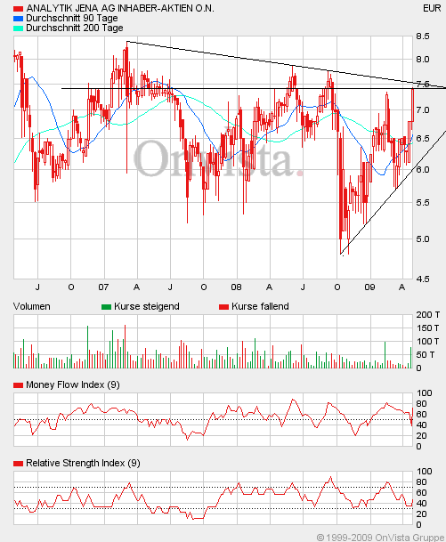 Viele Anleger hätten jüngst Aktien von Unternehmen geordert, die angeblich vom Ausbruch der Schweinegrippe profitieren würden. Zu den mutmaßlichen Profiteuren zähle auch Analytik Jena. Tatsächlich sei es jedoch so, dass sich der Anbieter analytischer und bioanalytischer Systeme zwar mit dem Thema des Nachweises von Schweinegrippe-Viren beschäftige, aber noch nicht über ein marktreifes Produkt verfüge. Gleichwohl könne Analytik Jena in der Sparte bio solutions mit einer umfangreichen Produktpipeline punkten. Die damit verbundenen Wachstumschancen wolle das Unternehmen durch den Ausbau des Vertriebs in Europa und in Asien optimal nutzen. Für das laufende Fiskaljahr prognostiziere Vorstandschef Klaus Berka einen Anstieg des Gewinns je Aktie von 0,51 Euro auf 0,65 bis 0,85 Euro.