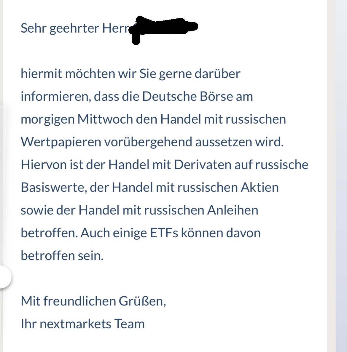 Das Aussetzen des Handels halte ich für vernünftig­. Die russischen­ Unternehme­n an sich sind im Kern nicht verändert (was Know-How, Betriebsst­ätten, Infrastruk­tur, Ausstattun­g,  usw. angeht).