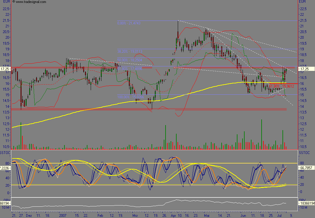 Kommentar: Die Flieger heben ab, doch die Aktie bleibt noch am Boden. Dies sagt uns zumindest die Charttechnik. Gefangen in einem Dreieck, das sich aus Auf-/Abwärtstrend und Unterstützung bildet, kommt die Aktie wahrscheinlich kaum nachhaltig über die Marke von 14,50 Euro. Dennoch glauben wir an Kurse bis 16,75 Euro, falls die Aktie genug Dynamik entwickeln kann. Zusätzlichen Support liefert das Fibonacci-Retracement um 14 Euro. Die Papiere dürfen nicht unter 12,20 Euro fallen, was weitere Abgaben zur Folge hätte.