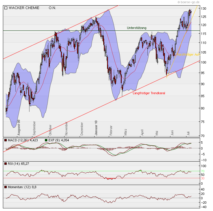 Charttechnisch gesehen ist nichtmehr viel Platz nach oben. Eine Korrektur ist nun langsam fällig. Platz nach oben wäre noch bis ca. 132€. Ganz klar ist die Aktie Überkauft und auch die Kursdynamik nimmt ab und auch die Bollingerbänder bieten kaum noch Luft nach oben! Hierbei mal ein Chart: