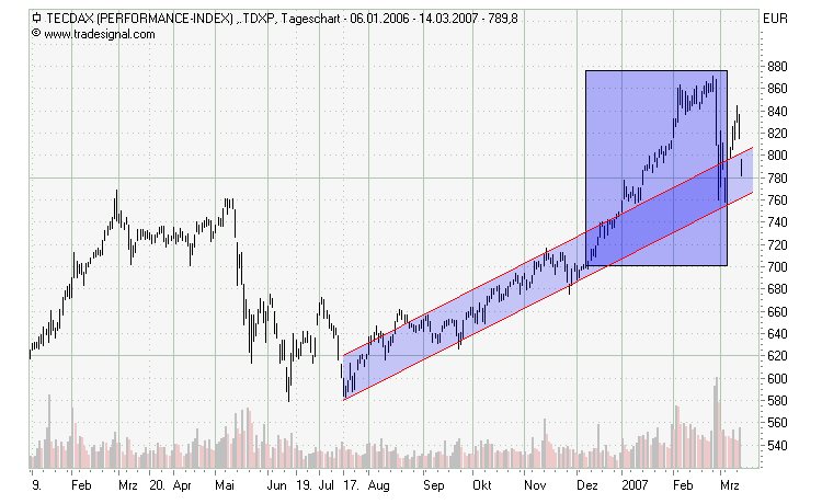 Der Tecdax hat zum Jahreswechsel 06/07 seinen nahezu 6 Monate stabilen und gesunden Aufwärtstrendkanal nach oben durchbrochen, um dann das Jahresziel vieler Analysten in nur 6 Wochen zu erreichen. Ein solch überhitzter Markt ist sehr anfällig, und die Meldungen aus Asien der letzten Tage waren nur noch der nötige Zündfunken, der die Korrekturlawine ins Rollen gebracht hat.