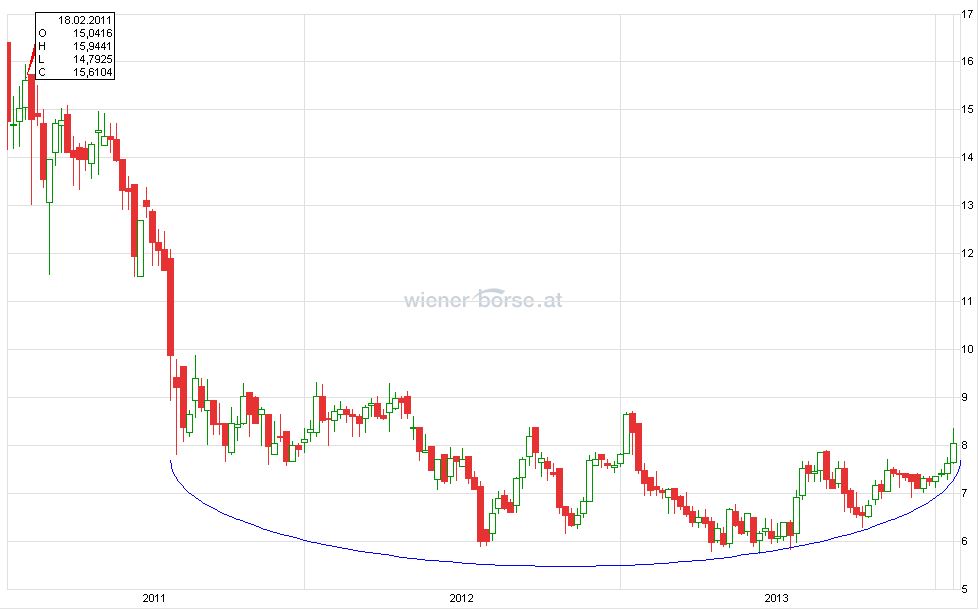 Natürlich kann die Aktie im Zuge einer globalen Korrektur noch etwas nachgeben .. was mich allerdings eher wundern würde. Die dreijährige Konsolidierungsphase, die mit ein wenig Phantasie einem Rounding Bottom gleicht, könnte demnächst vorbei sein und wieder zweistellige Kurse ermöglichen ..