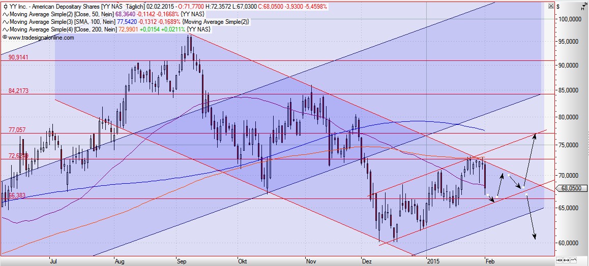 Die letzten Tage hat YY in der Relativen-Stärke wieder zugelegt, der Chart sieht nun wieder etwas freundlicher aus. Ich denke wir befinden uns seid März 2014 in einer langen Konsolidierungsphase mit aufsteigenden Tiefpunkten im Mai und Dezember. Mit einem Ausbruch über den alten Hochpunkt von 74,49 im September wäre die Luft dann nach oben wieder frei und ein neuer Aufwärtzschub sollte beginnen. Das Aktionär Kursziel von 150 könnte dann durchaus noch in diesem Jahr gesehen werden. Zumindest wenn der Gesamtmarkt einigermaßen stabil bleibt und YY fundamental weiter so stark voranschreitet.