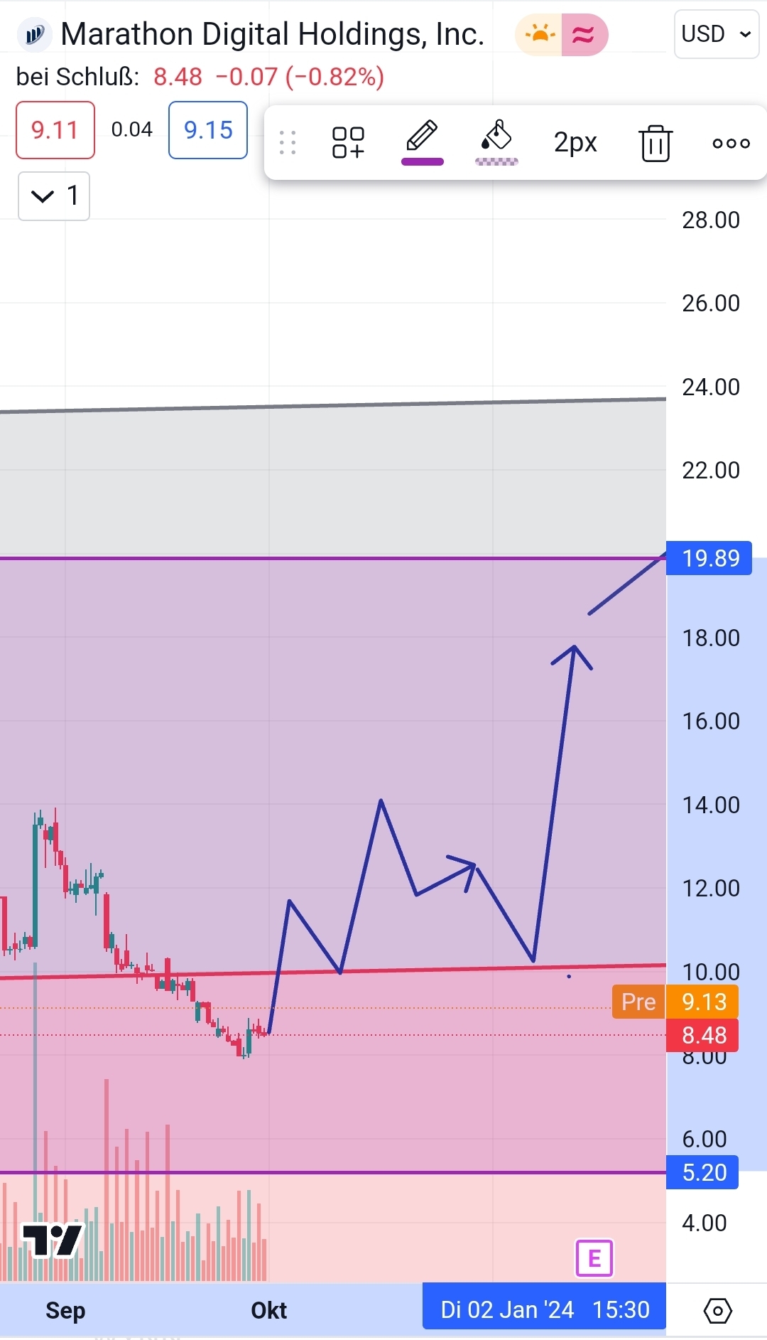 wenn Mara den Bereich 9,45 -10 rausnimmt haben wir defnitiv potential auf einen Verdoppler­ mit einem starken Btc im nacken. Aber muss sich erst zeigen ob sie das auch will :D