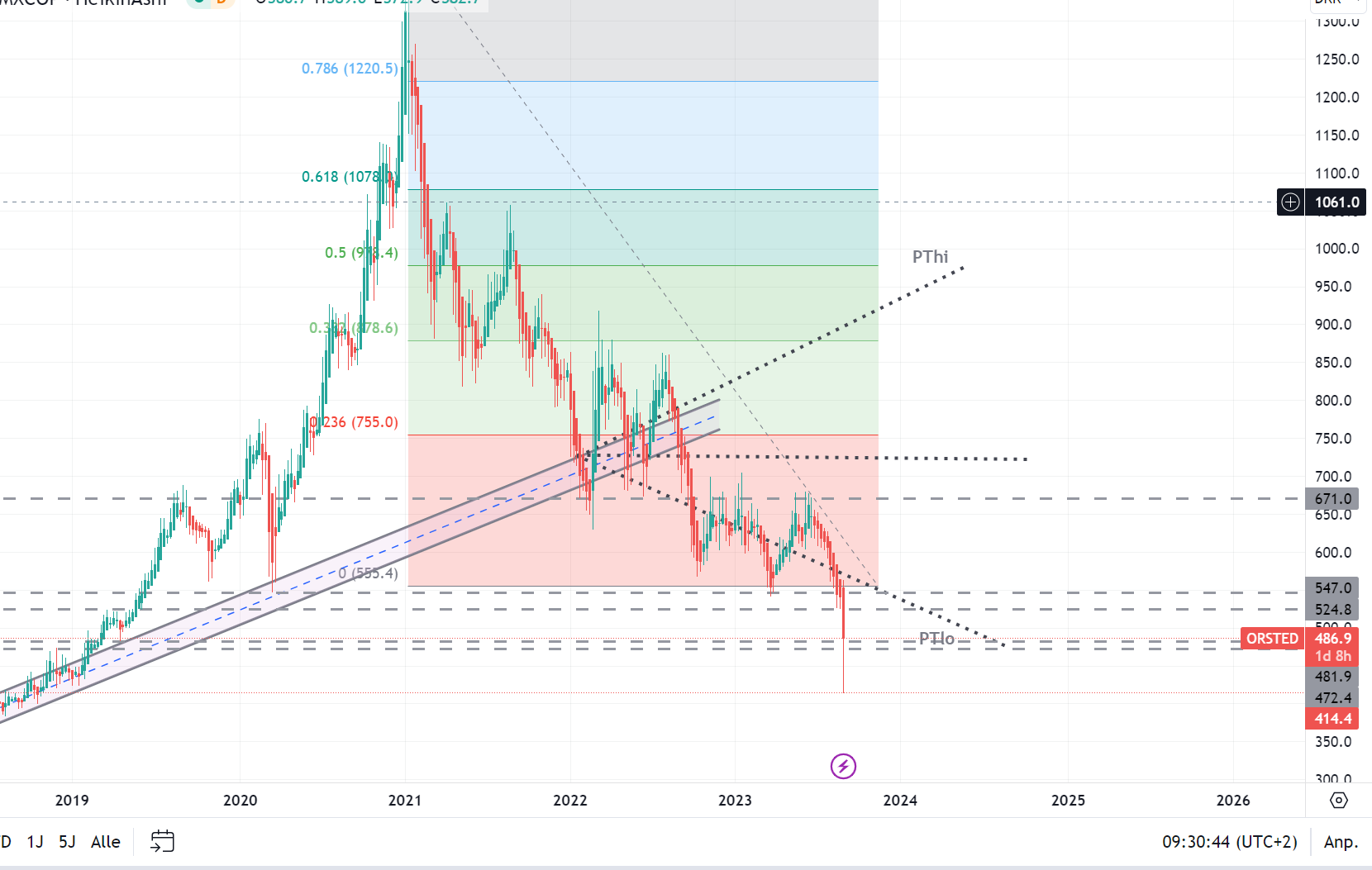 So Leute, anbei ein Screenshort aus der CT, ich habe zwei Fibo Strecken, die imo technische saubere, letztes Verlaufshoch vor der Abwärtsbewegung vs. bisheriges Verlaufstief und eines Strecke der reinen Abwärtsbewegung. Wenn man nach oben denkt und davon ausgeht, dass sich das erst mal wieder stabilsiert. Die 0,786er, so wie ich gezeichnet habe, sind damit die ersten Ziele, D.h. der Kurs sollte 444 und sauberer 470 DKK erreichen. Soll, nicht muss, dass ist die erste Mindesterholung. Schafft der Kurs das nicht, dann schlecht. Das muss aber jetzt nicht heute oder morgen sein, aber so lange diese Wert nicht überwunden sind, ist ein weiteres Verkaufstief sehr wahrscheinlich. Damit wir das Thema Bodenbildung, Stabiliserung oder sogar Trendumkehr haben, muss es den 0,618er nachhaltig (mindestens eine volle Kerze im Tag) packen. Da reden wir über 467 -514 DKK.