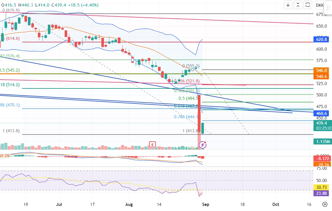 Spiegelung bis 400DKK, wegen Endspielverhalten (siehe Spieltheorie) könnte das aber schon bei 416 - 420 DKK zum Erlahmen kommen. Nackenlinie 540 DKK.