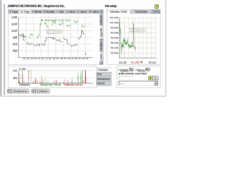 Der Router-Markt soll in nächster Zeit wieder expandieren (für beide Marktführer, Cisco und Juniper, positiv), UBS u.a. Analysten bewerten die Aktie positiv, aber trotzdem leidet der Kurs heute besonders stark.