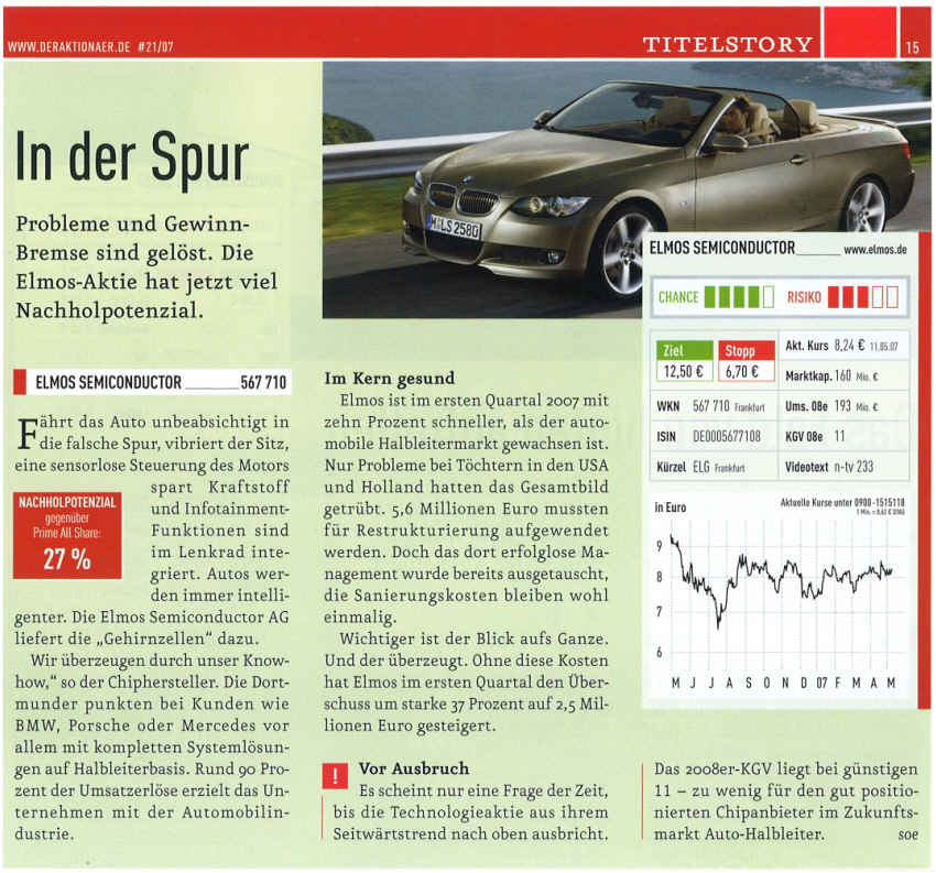 Es scheint nur eine Frage der Zeitbis die Aktie aus ihrem Seitwärtst­rend nach oben ausbricht.­Das 2008-KGV liegt bei günstigen 11 - zu wenig für den gut positionie­rten Chipanbiet­er im Zukunftsma­rkt Auto-Halbl­eiter