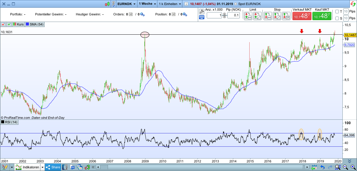 Dafür bin ich gestern EUR/NOK short gegangen. Entscheidend war für mich die Wochenkerze und die Indikatorenlage. Ziel ist die SMA.