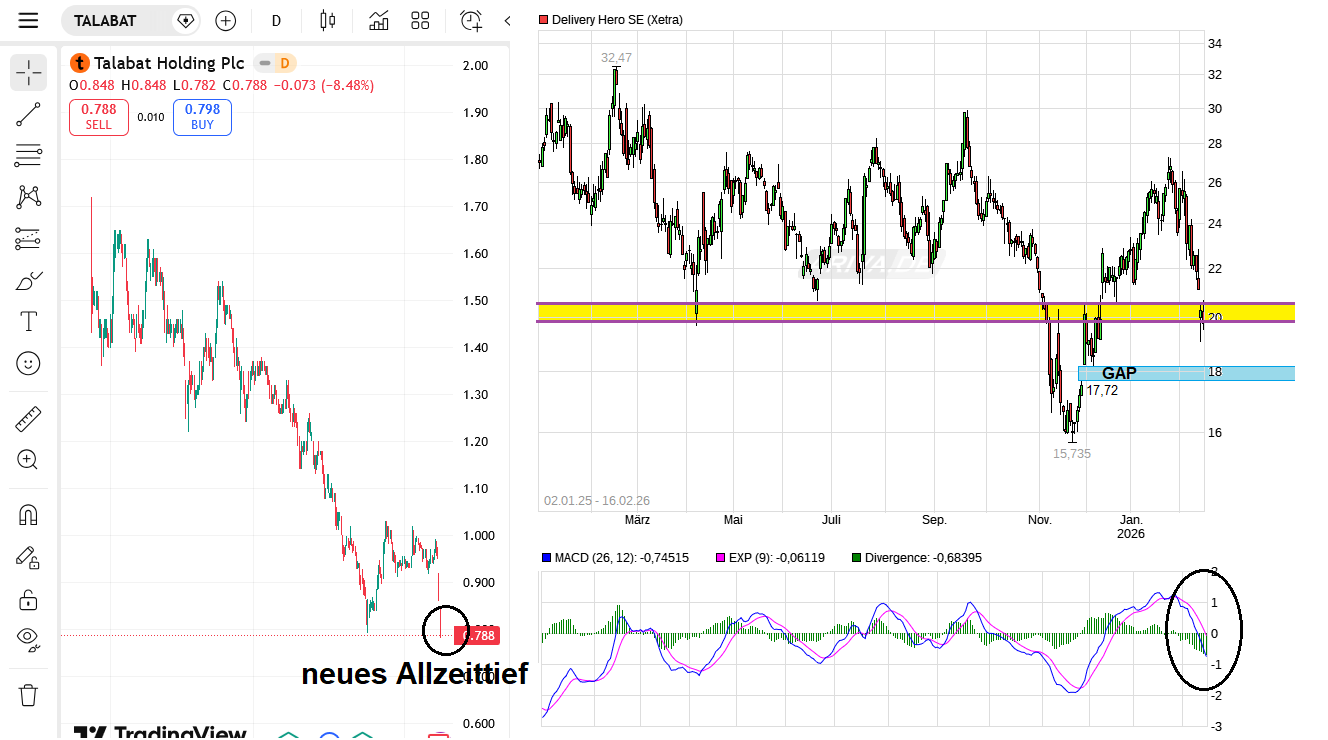 Heute also dann die Meldung über enttäusche­nde Zahlen bei Talabat. Das hat den Talabat Kurs dann wieder unter den Unterstütz­ungsbereic­h bei ca. 0,91/ 0,92 getrieben und man nähert sich nun wieder dem alten Allzeittie­f. Damit ist die  Erhol­ung des Talabat Kurses zu großen Teilen wieder weg. Natürlich verliert man durch die absolut trostlose Kursentwic­klung von der Tochter Talabat Milliarden­ an Substanz bei Delivery Hero. Da müßten eigentlich­ bei einem Impairment­ Test auch mal irgendwann­ Wertberich­tigungen vorgenomme­n werden bei DH. Wenn also das einst wertvolle Tafelsilbe­r sich mehr und mehr wieder in Blech verwandelt­, dann geht der DH Aktienkurs­ eben auch weiter nach Süden zurück.  Ist die Frage wie nachhaltig­ sich diese Talabat Schwäche jetzt weiter in 2026 durchzieht­. Denn das eigentlich­e operative Geschäft von DH ist ja nicht besonders sexy bzw. dürfte kaum sonderlich­e Gewinnsprü­nge machen. Und bislang hat man ja nur 20% an Talabat abgegeben.­ Es war ja angedacht später weitere Anteile zu verkaufen.­ Nun hatte man bei deutlich höheren Talabat Kursen aber gesagt, daß man bei diesen tiefen Kursen nicht verkaufen würde. Jetzt geht es seitdem aber immer tiefer.  Wird Talabat damit für DH mit dem Argument quasi unverkäufl­ich, wenn man nicht wieder deutlich kursmäßig anzieht?