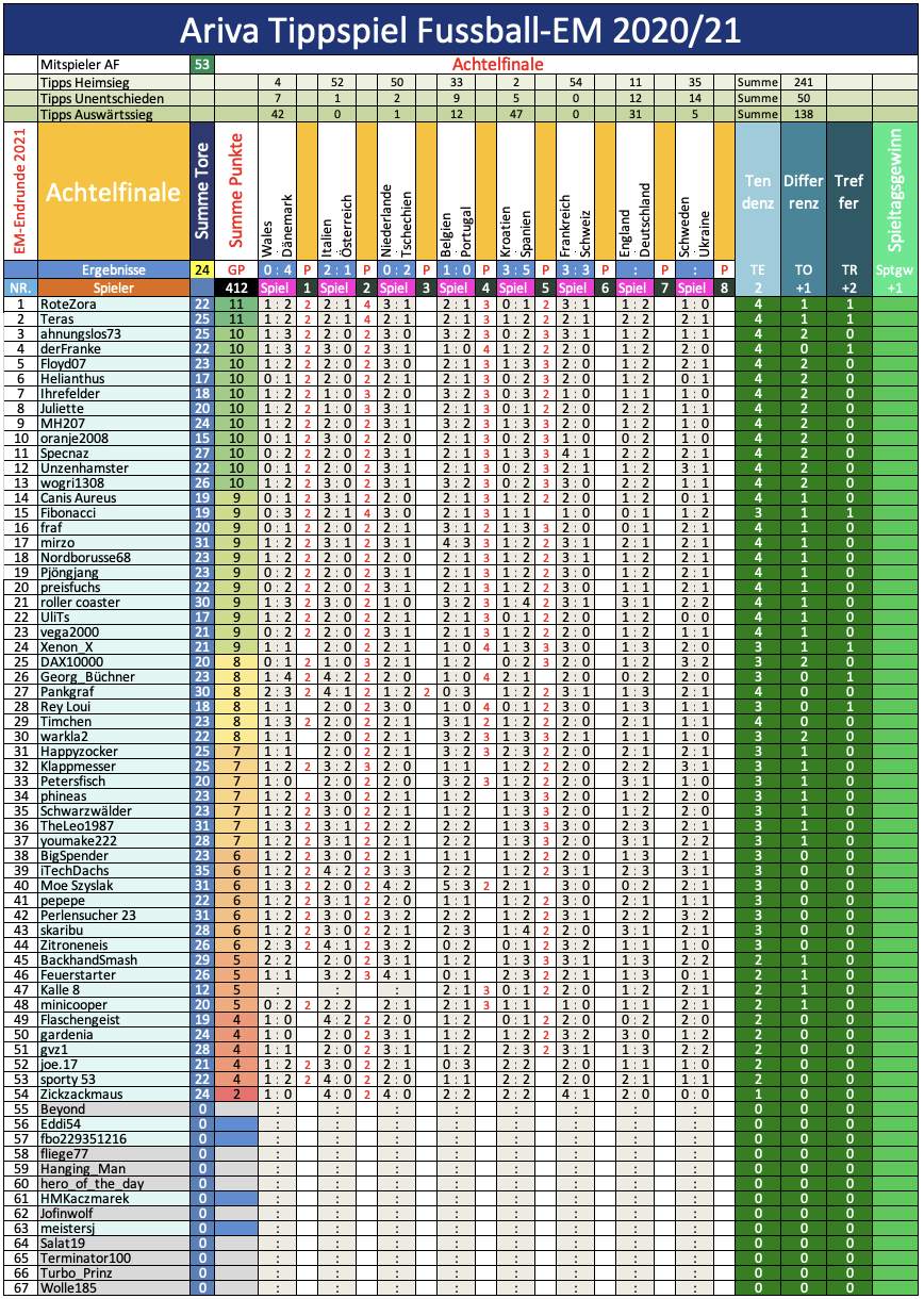 Fibonacci & Helanthius­ mit 13 + 1 Punkt Gewinner der Tipprunde Achtelfina­le, -BackhandSm­ash tippt die richtige Toranzahl (29) & sichert sich den Zusatzpunk­t.