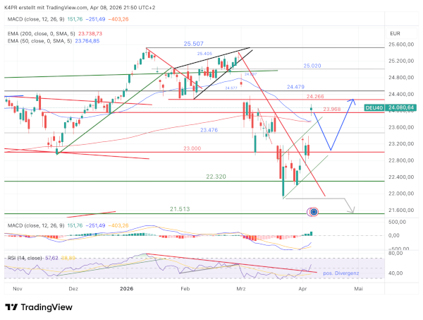 Sollte sich danach eine stabile Basis bilden, könnten die Kurse erneut steigen. Ein nächstes Ziel läge bei 24.479 Punkten. Falls die Nachrichtenlage weiterhin positiv bleibt, wäre sogar ein weiterer Anstieg denkbar, bevor der Markt in eine ruhigere Sommerphase übergeht.